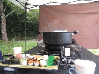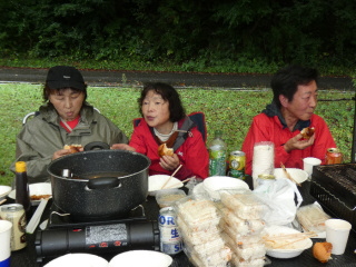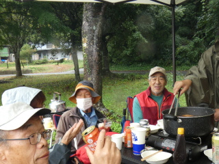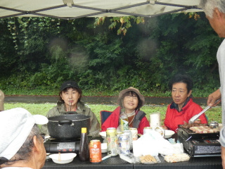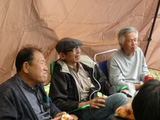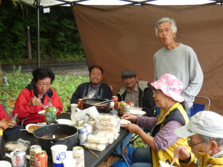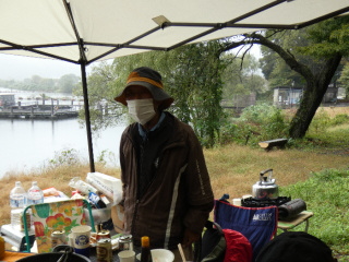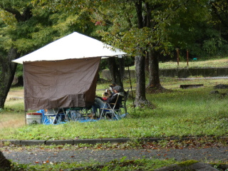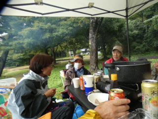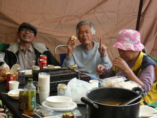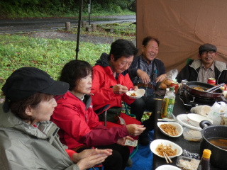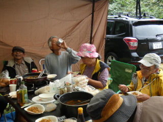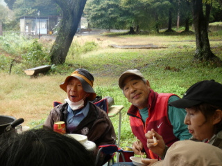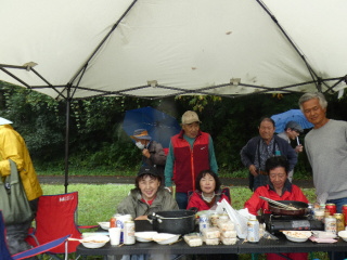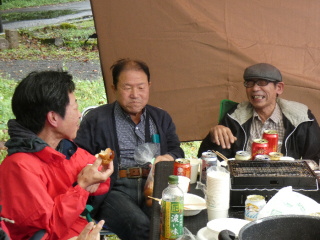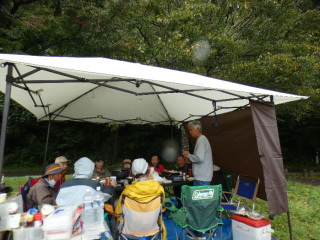 タープの下で片寄せあっての談笑会 久しぶりの懐かしい顔 毎度おなじみの顔